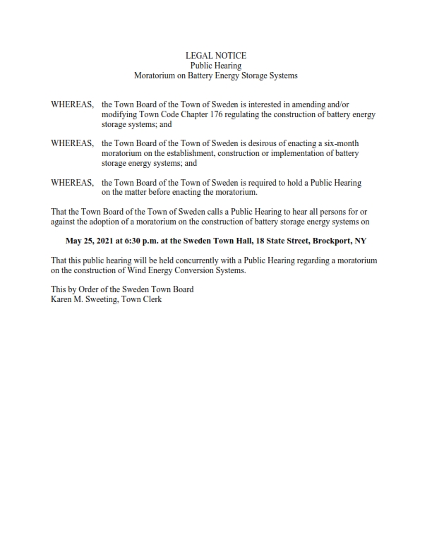 Town Board Public Hearing - Local Law - Moratorium Battery Storage Systems