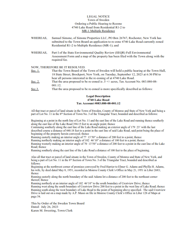 Town Board - Public Hearing - Rezone 4740 Lake Road